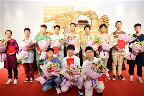 据艺术学院副院长王晓平介绍,本次开馆共展出作品近170件。其中揭幕的建国70周年木雕作品《大国足迹》,该作品由木雕艺术设计专业师生耗时四个月,集中展现了祖国经济腾飞、科技发展、文化繁荣。