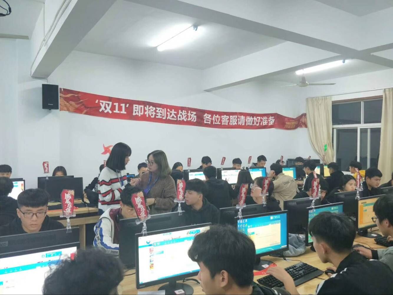 当天0点,17软件技术2班的学生杜伟伟,和所有奋战在电脑前的客服一样,指尖正飞快地在键盘上跳跃,忙着给所有的客户答疑解惑。从实训初期的培训,到实操,再到今天正式上线迎战,杜伟伟说自己付出了十分的努力。