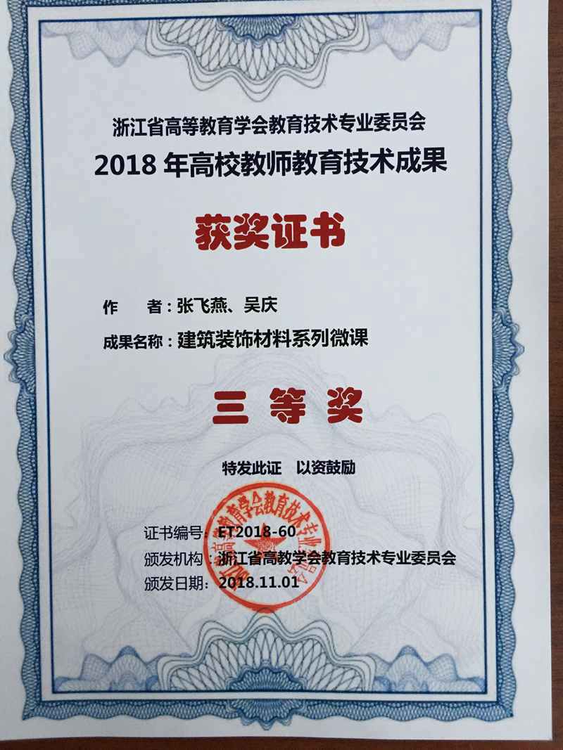 近日,由我院教师张飞燕、吴庆等拍摄的“建筑与装饰材料系列微课”荣获“2018年浙江省高校教师教育技术成果评比”三等奖。