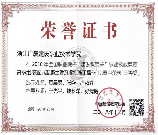 2018年12月22-23日,2018年全国职业院校“建设教育杯”职业技能竞赛在江苏城乡建设职业学院举行,共有来自全国高校的60支队伍参加本次竞赛,我院两支队伍分别获得高职组“装配式混凝土建筑虚拟施工”操作二等奖和三等奖的好成绩,本次竞赛设团体奖,一等奖占比10%,二等奖占比20%,三等奖占比30%,我院两支队伍分别位于13和27的名次。