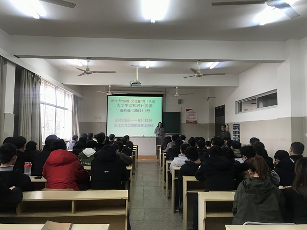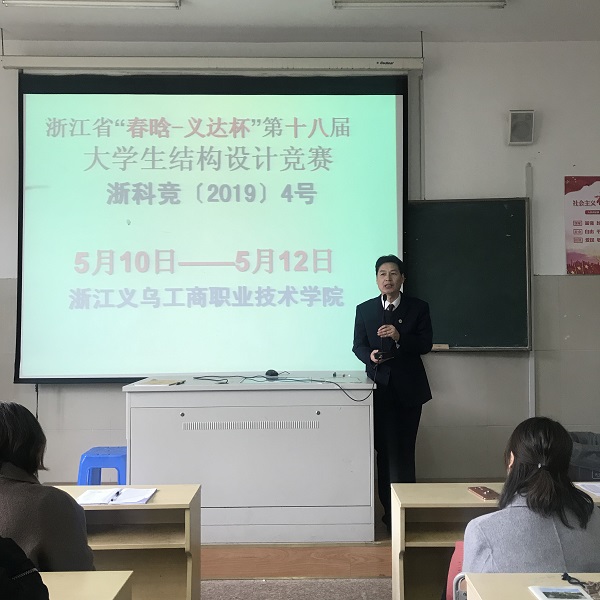 3月8日下午,在建筑工程学院J—123教室举行了2019年浙江省第十八届“春晗-义达杯”大学生结构设计竞赛赛前集中培训。广厦学院教务处孙丽雅、建筑工程学院副院长宁先平、建筑工程学院副书记金小华、院长助理王春福、专家教研室林有智和赵冬梅、比赛负责人张涛、全部指导老师和34组同学出席了该活动。培训由建筑工程学院院长助理王春福主持。