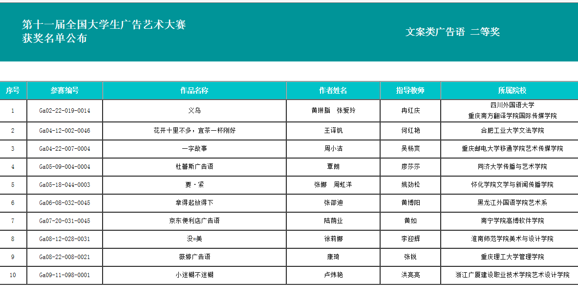 据了解,全国大学生广告艺术大赛(大广赛)——中国最大的高校广告艺术传播平台,是由教育部高等教育司指导、教育部高等学校新闻传播学类专业教学指导委员会、中国高等教育学会广告教育专业委员会共同主办,中国传媒大学、全国大学生广告艺术大赛组委会承办的全国高校文科大赛。大广赛是迄今为止全国规模最大、覆盖高等院校较广、参与师生人数多、国家级大学生赛事。自2005年第一届大广赛开始至今,全国有一千三百多所高校参与其中,数十万学生提交作品,形成了稳定的、成熟的、具有相当规模的大学生教学实践平台。
