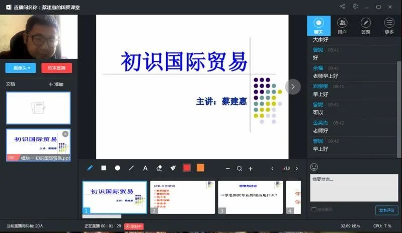 《国际贸易实务》课程组采用了直播课+线上学习的方式,蔡建惠老师教学风格风趣、幽默,一面教学一面在班级微信群中开展现场问答,学生亲切的称之为“被教学发掘的新一代网红主播”。开学首日,各平台都有很严重的卡顿现象,还有部分老师把直播平台放在了抖音上,多套备用方案保障教学顺利开展。