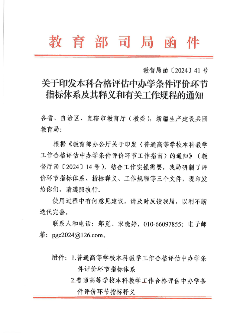 关于印发本科合格评估中办学条件评价环节指标体系及其释义和有关工作规程的通知 (教督局函〔2024〕41号 ) 来源: 作者: 发布时间:2025-11-10 浏览次数: 次 【字体:小 大】 【打印正文】