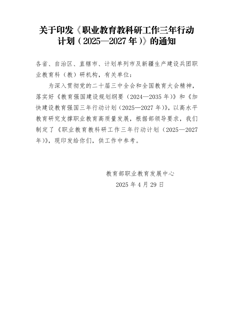 关于印发《职业教育教科研工作三年行动计划(2025—2027年)》的通知