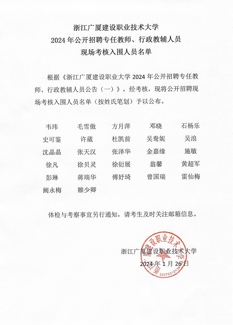 2024年公开招聘专任教师、行政教辅人员现场考核入围人员名单