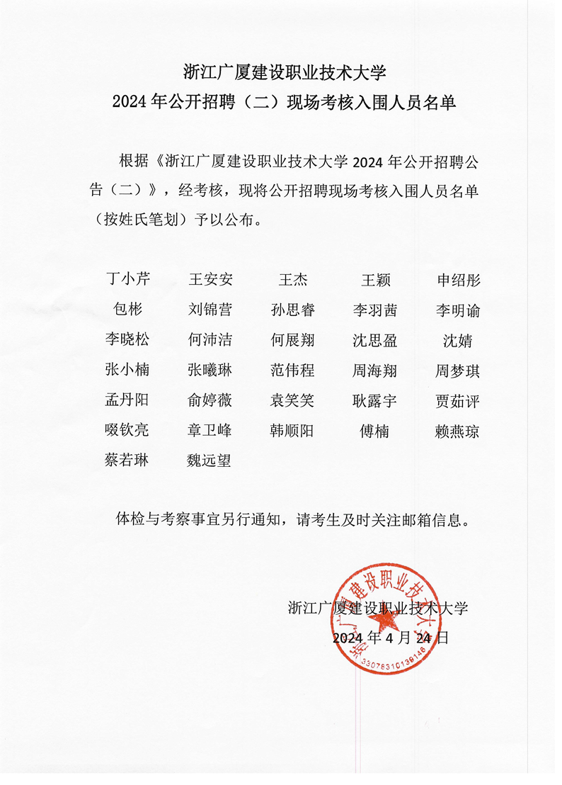 浙江广厦建设职业技术大学2024年公开招聘(二)现场考核入围人员名单