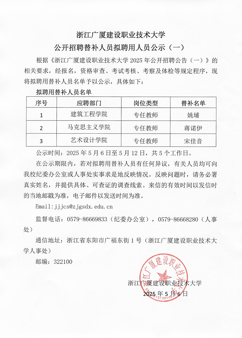 浙江广厦建设职业技术大学公开招聘替补人员拟聘用人员公示(一)