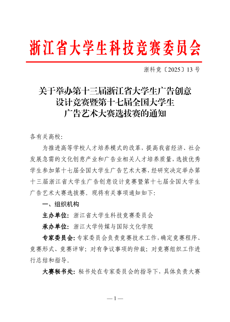 关于举办第十三届浙江省大学生广告创意设计竞赛暨第十七届全国大学生广告艺术大赛选拔赛的通知 来源: 作者: 发布时间:2025-08-26 浏览次数: 次 【字体:小 大】 终审:宣传部01管理员 【打印正文】
