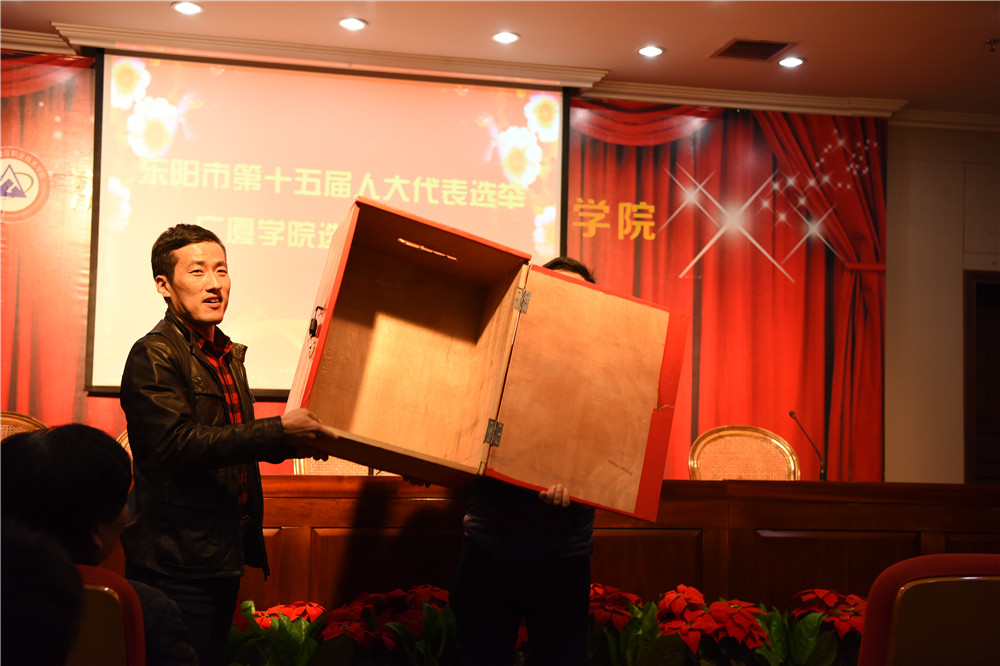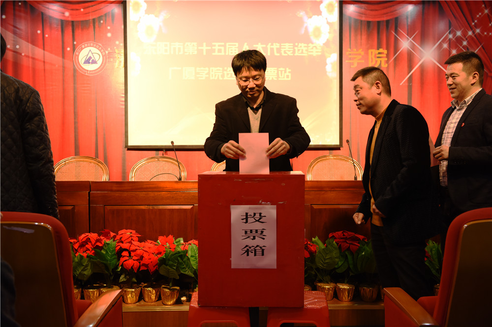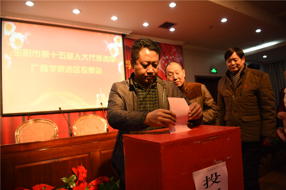 投下神圣一票 选好人大代表 来源: 作者: 发布时间:2016-12-13 浏览次数: 次 【字体:小 大】 东阳市第十五届人大代表换届选举工作正进行得如火如荼,广厦学院作为第十三选区,学院领导高度重视,积极部署,并按照相关规定,严格执行。 12月12日晚7点,工作人员对有关事项进行说明,监票人现场检查票箱后,广厦学院选举投票正式开始。经过认真考虑和细心填写,学院5778名师生、职工陆续来到投票箱前,投下代表权利和意愿的庄严一票。 【打印正文】