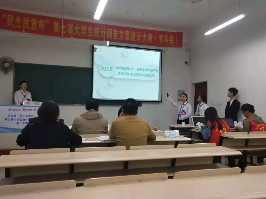 本次大赛共收到全省高校校500余件作品,最终高职组22个项目进入决赛,现场决赛设PPT作品展示和专家提问答辩两个环节。经过激烈竞争,由经外学院陈长英、金栋梁老师精心指导,周晓梅、金形形、郭俐君、龚雪梅、肖柳妮等五位同学共同完成的参赛作品“电商精准扶贫”战略下网销农产品质量控制现状及影响因素分析,在总决赛环节发挥出色,顺利拿下浙江省第七届统计调查方案设计大赛的一等奖。