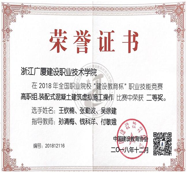 2018年12月22-23日,2018年全国职业院校“建设教育杯”职业技能竞赛在江苏城乡建设职业学院举行,共有来自全国高校的60支队伍参加本次竞赛,我院两支队伍分别获得高职组“装配式混凝土建筑虚拟施工”操作二等奖和三等奖的好成绩,本次竞赛设团体奖,一等奖占比10%,二等奖占比20%,三等奖占比30%,我院两支队伍分别位于13和27的名次。