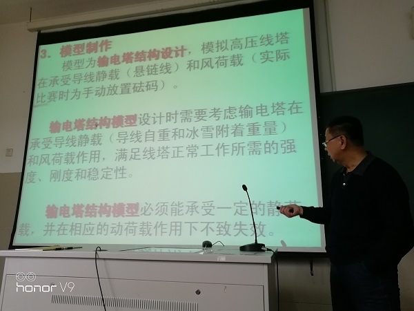 比赛负责人张涛老师从竞赛内容、参赛要求、模型制作、加载测试、评分规则五个方面做了非常详细的赛事介绍,并展示了往届参加省赛的模型。同学们现场学习,观看往届的模型,张涛老师“手把手”教学,理论联系实际,并对各个学生团队中存在的问题进行分别指导,培训受到了在座同学的热捧。